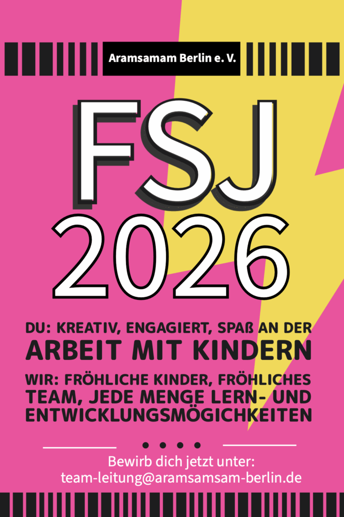 Aramsamam Berlin e. V. ist anerkannte Praxisstelle für Praktikant:innen in der Erzieher:innenausbildung. Darüber hinaus bieten wir pro Kindergarten einen Platz für das Freiwillige Soziale Jahr (FSJ) und Auszubildende in der Erzieher:innenausbildung.